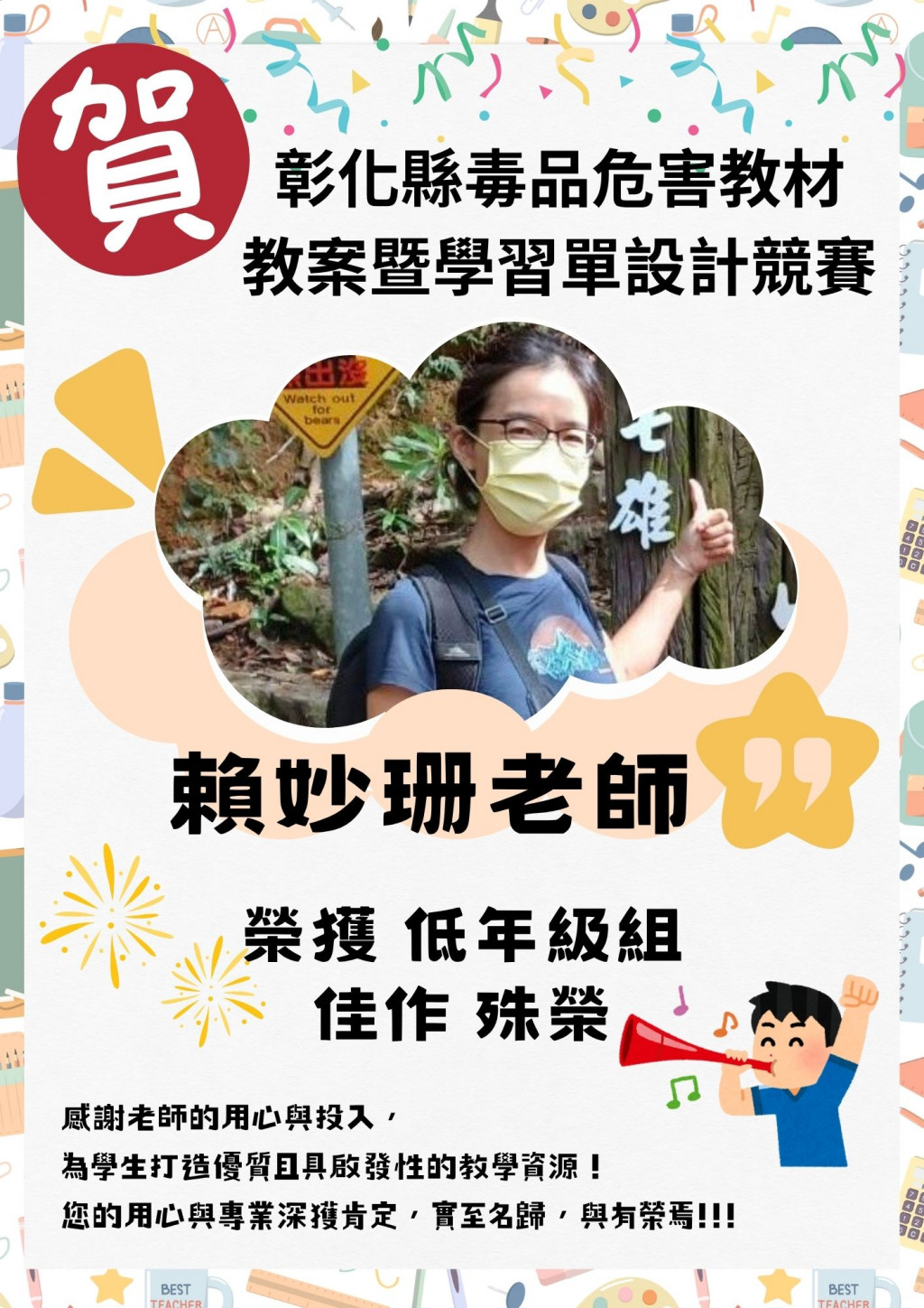 🎊 狂賀!狂賀! 🎊 恭喜 賴妙珊老師 參加「彰化縣毒品危害教材教案暨學習單設計競賽」 榮獲 低年級組 佳作 殊榮!