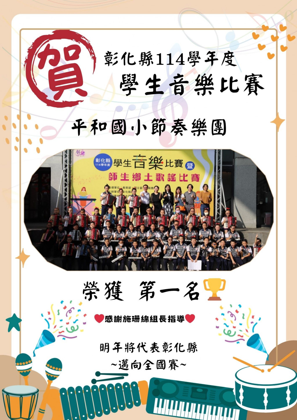 賀~1141117 彰化縣114學年度學生音樂比賽 🥁節奏樂團 榮獲 第一名🏆