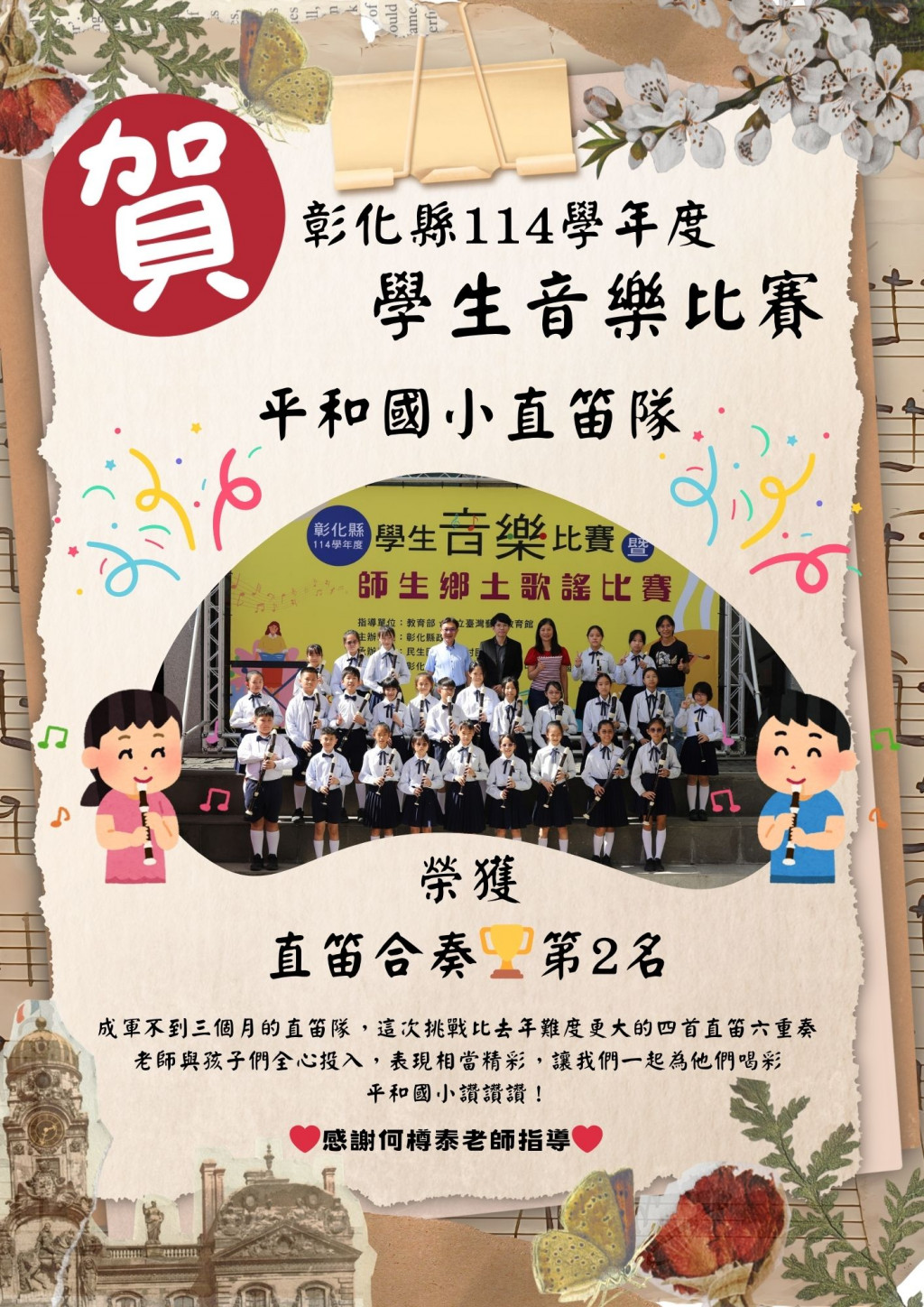 狂賀!彰化縣114學年度學生音樂比賽🎼 平和國小直笛隊😀 榮獲 直笛合奏🏆第2名