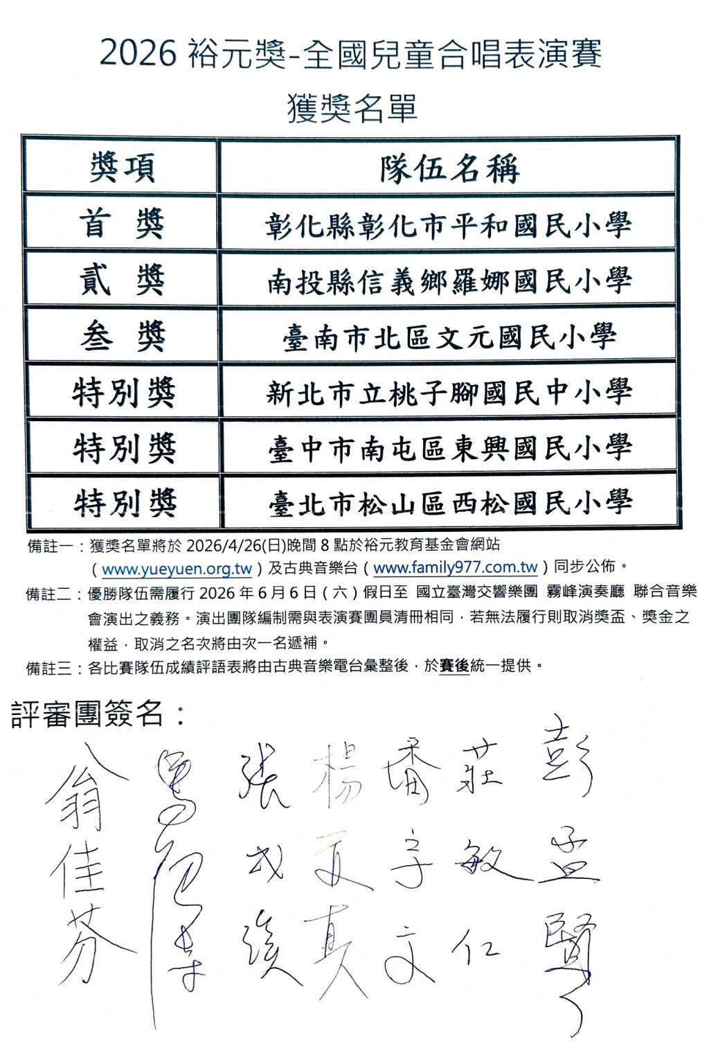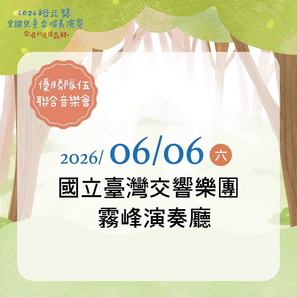2026 裕元獎全國兒童合唱表演賽,合唱團在林家羽主任指導下,從全國強勁對手中脫穎而出,拿下最高榮譽**「全國首獎」**!